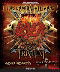 Az Unholy Alliance turné 3. fejezetének állomásait is sikerült remek vendégekkel felturbózni. Fellép még napjaink talán leggyorsabban és legjobban befutott metal zenekara, az amerikai Trivium. A fiatal amerikaiak 2003-ban jelentkeztek első lemezükkel, az Ember To Inferno-val, de az igazi áttörést a 2005-ös Ascendancy hozta meg. Az erősen metalcore alapokra építkező két lemezre bombaként robbanó, hihetetlen fogóssággal bíró dalokat pakoltak fel. A 2006-os The Crusade lemez egy kicsit puhábbra sikerült, Matt Heafy felhagyott az üvöltözéssel, és végig a dallamos énekre koncentrál, a nóták pedig még kimunkáltabbak, még precízebbek lettek, tehát a színvonal továbbra sem kérdőjelezhető meg. Sokaknak nem tetszett az új irányvonal, de az idei Shogun lemez gyakorlatilag mindenkinek fricskát mutatott, hiszen a csapat újra bedurvult, előkerültek ismét az Ascendancy-s üvöltések, de a zene még technikásabbá, ha lehet mondani, még prog-osabbá vált. A srácok folyamatosan fejlődnek, élő teljesítményük pedig sosem adott panaszra okot. Hatalmas lehetőség nekik a Slayer előtt játszani, és egész biztosan nem fognak csalódást okozni.