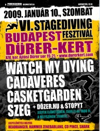 A Cadaveres és a Szeg albuma már a boltokban van - Evilution és Hazaértem címmel -, a Watch My Dyingé pedig, ha minden jól alakul, aznap fog megjelenni. A hármas bemutató mellett a CasketGarden fellépése is izgalmasnak ígérkezik, hiszen ilyen méretű helyen még sosem mutatták be a harmadik lemezüket, az Incompleteness In Absence-t. A keretes szerkezet megőrzése érdekében a nyitóbanda szerepét a feltörekvő extrém metalos Stopyt Budapestről, míg a zárási feladatokat a matekos hardcore-ben erős bajai Dózer.hu tölti be. A helyszín sajnos megint változott. Úgy látszik ez már örök jellemzője lesz a Stagediving Fesztiválnak. A VI. Stagediving Fesztivál a Dürer Kertben (Budapest XIV. kerület Ajtósi Dürer sor 19-21.) kerül lebonyolításra, és nem az előzetesen tervezett és hirdetett Ráday Music Pubban. A Dürer kertet a következőféleképpen lehet megközelíteni: 1-es villamos 4 perc, 7-es, 73-as busz 3 perc 70-es troli 5 perc, 74 / 75-ös troli kert előtt. Ingyenes a parkolás az utcákban. A hely egyébként a Pecsához van közel, a Városliget mellett. A komolyabb nemzetközi és magyar underground metal/HC bulik 2009 elején mind itt kerülnek megrendezésre. A helyszíni bejárás alapján hangulatában a lerombolt Kultihoz hasonlító, de kevésbé lepusztult, dögös klubot láttunk. Az elővételes jegyen még a Ráday szerepel, de ettől függetlenül érvényes. A belépőket a Hammer Zenebarlangban, a Sharkban, a CD Pincében, a Headbangerben és a Powerground Webshopban lehet megvásárolni december 15-ig 1500 Ft-ért, majd január 10-ig 1800 Ft-ért, a helyszínen pedig 2000 Ft-ért. Az első 100 érkező Powerground válogatás / Endless - Invasion Of The Male People promó CD-t kap ajándékba
