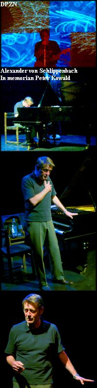 Alexander von Schlippenbach - In memorian Peter Kowald Peter Kowald a XX. század egyik legfontosabb zenésze volt. Sajnos csak volt. És a Nagy Fül Fesztivál közönsége már nem ülhetett egy teremben ezzel a nagyszerű német muzsikussal. A váratlan haláleset gyors beavatkozást igényelt, ami talán a legjobban sikerült, hiszen Kowald Globe Unity Orchestrabeli társát Alexander von Schlippenbachot kérték fel a megemlékezésre. A talpig úriember nem kezdett több perces beszédet tartani, hanem köszönt és leült a zongora elé. Úgy emlékezett meg pályatársáról, ahogy a legtöbbet kommunikáltak együtt, és ahogy a legtöbbet beszélgettek közönségükkel, a zenenyelvén. Ritmusok, dallamok, gyorsaság, lassúság, kompozíciók, töredezettségek. A legjobb módja egy megemlékezésnek, ha egy zenészről van szó. Önálló, néma megemlékezés kollektívan. Nehéz lenne átadni, és persze nem is lehet, mert biztos vagyok benne, hogy mindenkinek más képek peregtek a szemei előtt a zongora szóló alatt. Lehet, hogy Kowaldról