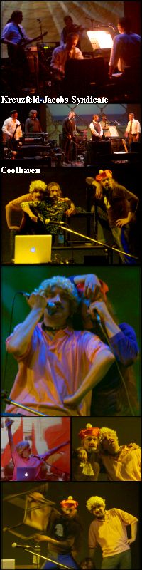 Kreuzfeld-Jacobs Syndicate a pénteki nap egyetlen magyar fellépője volt. Bebizonyította, hogy ebben a stílusban nálunk is vannak értékes és értékelhető dolgok, még ha néha esetleg más zenekarok behatását is lehetett érezni a zenéjükön. A hatásmechanizmusuk valahogy az Einstürzende Neubauten-t juttatta eszünkbe, de ez talán csak egy magán vélemény. Kezdetben kihasználták a színház adta teret és döbbent csendet mely ott lebegett valahol a közönség felett. Az összhang egy kis közös meditációra adott lehetőséget. Nyitóképként a zenészek egyenként a nézőkkel szembe, majd később háttal foglaltak helyet. A megkomponált képi világuk vezette a produkciót a kiteljesedéséhez. A háttérben mutatványkodó videópillanatképek és installációk alapjaiban határozták meg a zene építményét, ezzel erősítve a produkció teljességét. A megkomponált mű és a vetítés összhatása egy csodálatos testi és lelki megtisztulásra adott lehetőséget kellemes meglepetést okozva a nézőseregben (akik ezelőtt még nem ismerték a holland fellépőket).