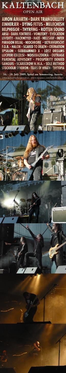 Eljött hát az utolsó banda ideje, és egyben a fesztivál végéé is. Utolsó bandaként a híres svéd viking/death metal banda, az Amon Amarth lépett színpadra. Kétségkívül az egész fesztivál szinte legerősebb bandáját jelképezték a svéd vikingek. Ki ne ismerné az 1992-ben megalakult, anno még Scum néven futó death/viking bandát, akik a tavalyi évben adták ki újabb nagyszerű lemezüket, a The Twilight Of The Thunder God-ot. A ceremóniát is ezen album címadó számával nyitották meg, melyet sok más szintén új és régi szám egyaránt követett, mint például a Guardians Of Asgaard, a Varyags Of Miklagaard, a Live For the Kill, a With Oden On Our Side, a The Fate Of Norns, a Once Sealed In Blood, a Versus The World, és a Death In Fire. Johan Hegg énekes nagyszerűen bánt a tömeggel: énekeltette, együtt ivott, bátorította a népet, és mindemellett kiválóan acsarkodott az éjszakába. A gitárosok, Olavi Mikkonen és Johan Söderberg sebészi pontossággal játszották el a számokat, mintha csak a lemezen hallgatta volna az ember, ontották hangszereikből a vastag, viking riffeket. Ted Lundström basszeros hibátlanul követte a fogós gitártémákat, és mindezek mellé Fredrik Andersson dobos kiváló témái dübörögtek egészségesen. Nagyszerű koncertet adtak a híres vikingek: ez volt az első Amon Amarth koncertem, de az biztos, hogy amíg élek, nem felejtem el, mert kevés ilyen nagyszerű banda van, mint ők. A hangzás is hibátlan volt, úgy látszott addigra már összeszedték magukat a hangosító srácok ott a keverőpult mögött. Száz szónak is egy a vége, az Amon Amarth kiváló teljesítményt nyújtott, ők voltak az idei Kaltenbach fénypontjai. Miután vége lett a koncertnek, összefagyva és hulla fáradtan beálltam az osztrák fanatisták közé, hogy a színpad előtti területen az eső áztatta sáros tőzegben én is pengetőre leljek, de nem jött össze, így hát hosszabb keresgélés után visszatántorogtam a sátrunkhoz, aztán egy újabb remek nap után elégedetten hajtottam fejem békés álomra. (Deviant)