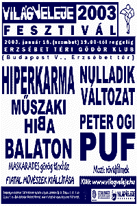 szerző: VilágVeleje.HuVilágVeleje Fesztivál 2003 2003 január 18 (szombat) 19.00-tól reggelig Erzsébet Téri Gödör Klub
