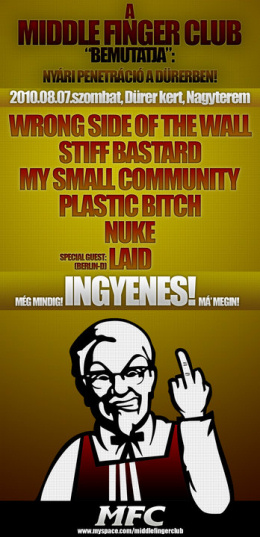 Nyár van. Elmentünk hát fesztiválozni, nyaralni, kertekben és parkokban italozni, elvertük az összes pénzünket, majd borzasztóan elkezdtük hiányolni egymást. Ha ezek közül bármelyik igaz rád is, azaz pénz szűkében vagy és kimarad a Sziget (esetleg biztosra akarsz menni és előtte tesztelni, hogy bírod -e még a rákkenroll-t), vagy elmondhatatlan kínokat okoz a hiányunk, akkor tarts velünk a spontán fénysebességgel összeharácsolt nyári Middle Finger Club csúcstalálkozóra, ahol az öt alap penészbrigád (Wrong Side Of The Wall, Stiff Bastard, My Small Community, Plastic Bitch, Nuke) mellett auditív kezelésben részesít titeket a Berlinből hozzánk látogató Laid is. A bál konok MFC dogmák alapján nőknek, törököknek, pékeknek és mindenki másnak INGYENES, a merch árak porba hullnak, a regionális jókedv pedig mennybe szökell majd előreláthatólag a Dürer Kert nagytermében 2010. augusztus 7-én, 20.00-ás kezdettel.