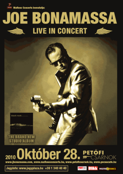 Amerika egyik legtehetségesebb blues-rock gitárosa, Joe Bonamassa 2010. október 28-án ismét hazánkban látogat, és a Petőfi Csarnokban ad koncertet. Bonamassa játékát tökéletes technikai tudás, ízes, érzelmekkel teli játék jellemzi, a jól kidolgozott saját és feldolgozás nótákban.