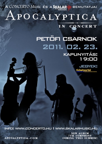 2011. február 23-án A Petőfi Csarnokban láthatjuk vendégül ismét a finn a Apocalyptica legénységét. A jegyár 6900 Ft (elővételben) / 7900 Ft (helyszínen). Jegyelővételi helyek: The Lab (Király u. 48.), Speed Westend, Speed Mammut, Teenage Riot Store (József krt. 18.), Underground Store (Bem József u. 22.), Hammer Zenebarlang, CD Pince, Headbanger, Petőfi Csarnok.