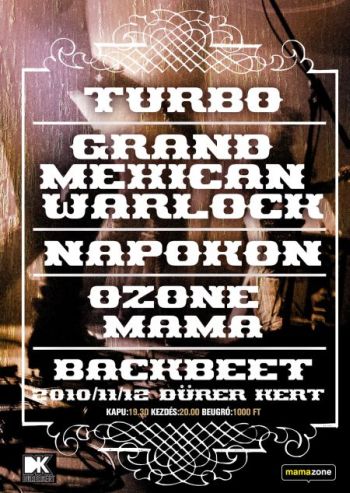 A tavaly év végi Düreres koncertet követően most november 12-én újra együtt áll a városligeti bálterem színpadára a Turbo és a Grand Mexican Warlock. Már ez magában garancia a kiváló szórakozásra, de pláne okot ad a megjelenésre, hogy olyan nagyszerű produkciók csatlakoznak az esthez, mint az első nagylemezét ez évben megjelentető és brutálisan ötös fokozatba kapcsolt Napokon zenekar, a pofátlanul fiatal és dögös BackBeeT és a rocknroll bulik ördögei, az Ozone Mama.