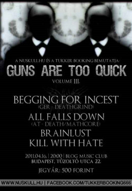 Két évvel ezelőtt a NuSkull.hu megálmodta, hogy szeretnének egy olyan koncertsorozatot indítani, ami nemcsak összehozza a NuSkull.hu látogatóit és a fórumunk felhasználóit, hanem egyben alkalmat is ad számukra ahhoz, hogy adott esetben új, lelkes és tehetséges zenekarokat ismerhessenek meg. A próbálkozás az akkori körülmények miatt sajnos szünetre lett küldve, ám az eltelt idő alatt is csak arra vártak, hogy ismét visszatérhessenek: így most, 2011 elején büszkén jelentik be, hogy a Tukker Bookinggal karöltve ismét működőképessé teszik a koncertsorozatunkat, a Guns Are Too Quicket. Ebből az alkalomból pedig egy olyan turnét hoznak el Budapestre, amely két friss és igen reményteli zenekar első magyarországi koncertjének ad alkalmat: a német deathgrind Begging For Incestről és az osztrák death/mathcore-pionír All Falls Downról van szó, akik a Brainlusttal és a Kill With Hate-tel fogják szórakoztatni ismételten ötszáz forint ellenében a nagyérdemű publikumot.