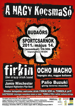 Fergeteges hangulatot ígérnek A Nagy KocsmaSó-ra 2011. május 14 -én szombaton a szervezők a Budaörsi Városi Sportcsarnokba. A görög hangulatot idéző Palio Buzuki, a dallamos latin-ska-reggae örömzenét játszó Ocho Macho, és a már Kanadában is jól ismert őrült ír zenekar, a Firkin, Jamie Winchester közreműködésével ad koncertet egy óriási happening keretein belül A Nagy KocsmaSó színpadán 19.30 órától.