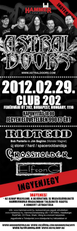 Február 29-én egy este találkozhatunk azzal az énekessel, aki joggal tarthatja magát Ronnie James Dio legfőbb örökösének, továbbá a Monster Magnet ritmusszekciójának örömzenélős projektjével, valamint egy olyan hazai heavy metal csapattal, amely már Thaiföld rockklubjait is meghódította. A budapesti Club 202 színpadán az Astral Doors, a Riotgod, valamint a hazai Crossholder és az Elfsong várja ezen az estén a hard rock és a heavy metal kedvelőit. Az aznap megjelenő márciusi Hammerworld Magazin megvásárlói ingyen juthatnak be a koncertre!