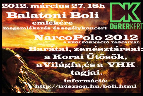 szerző: Dürer kertBúcsúkoncert Balatoni Boli (+1965.08.17 - 2012.02.26) emlékére Jótékonysági rendezvény a zenésztársak szervezésében 2012. március 27., Dürer Kert