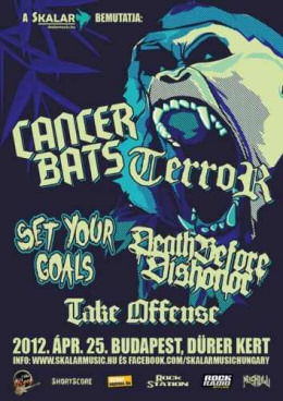 Sajnálatos hír, hogy a Skalar Music Hungary által szervezett Terror, Death Before Dishodor, Take Offense budapesti koncertjeit a menedzser magyarázat nélkül törölte. De senki se csüggedjen, hisz az immáron 6 éve töretlenül a kanadai / hardcore punk világát már-már uraló Cancer Bats érkezik kishazánkba a Set Your Goals kíséretével. A torontói banda a nagy hidegben is el tudta csípni a kissé Brites ritmusvilágot és gitártémákat, beépítették azt a jellegzetes „feszültségfokozást”, amit a déli zenekaroktól megszokhattunk, szépen fokozatosan elhagyva a modern hardcore/punk vonásokat. Pár finom húzással Liam Cormier egy ütős, a mai igazi hardcore/punk világában helyét megálló fokozatosan felfelé építkező bandát alkotott. A Hail Destroyer című album, míg csak áttörte a gátat a nemzetközi zenei világ és az „előzenekarok” közt, a Bears, Mayors Scraps & Bones már stabil helyet biztosított a srácoknak az élmezőnyben, a nem sokára megjelenő Dead Set on Living pedig mint egy korona a királyon, emeli fel a srácokat a legnagyobbak közé. Ezen a lemezen már vendégrésztvevők és átdolgozások nélküli setlist-re számíthat a nagyérdemű, azonban a Sabotage (Beastie Boys átirat) olyannyira kedvence lett a srácoknak és mai napig része a programjuknak, hogy jó eséllyel hallhatjuk majd április 25-én a hardcore mekkában. Míg a Cancer Bats zenéjét 2010. októberében élvezhettük, a pop-punk új hangja a Set Your Goals már öt éve nem látogatott kishazánkba. Ez számunkra csak abból az okból kedvező, hogy mióta a Kultiplexben láthattuk/halhattuk őket, hatalmas fejlődésen mentek keresztül. 2009-ben az Epitaph kiadó karolta fel őket. Ennek köszönhették két nagylemezüket, „belső letisztulásukat”, majd a Wapred Tourjaikat, többek közt a The Ghost Inside-dal. Így, ha valami ütős, friss és energikus koncertre vágysz, áprilisban irány a Dürer kert.