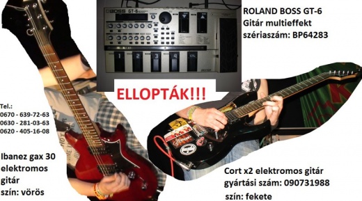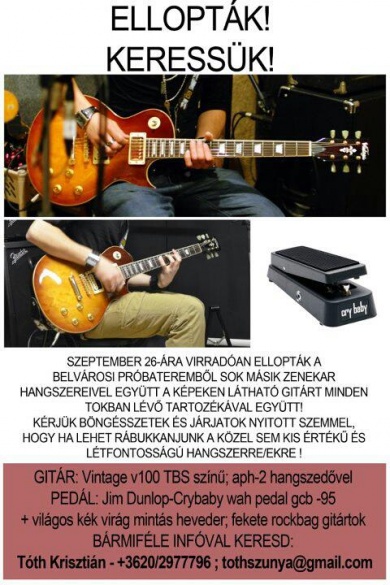 A rendőrségen az eltűnt tárgyakért feljelentést tettek. A ti segítségetek azért kérem a megosztásban, hogy a fiatal, nincstelen zenészpalánták ne vegyék meg az ellopott hangszereket, felbuzdulva azon, hogy olcsón kapnak felszerelést. Ha látod ezeknek a cuccoknak akármelyikét, vagy valaki adás-vétel céljából kínálná, akkor kérjük, hogy azonnal hívd az alábbi telefonszámok egyikét: