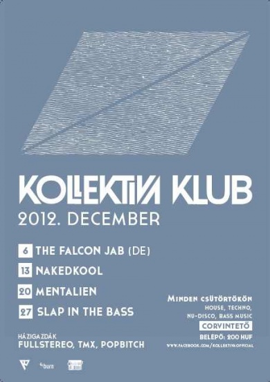Az új formátumú Kollektiva Klub első vendége december 6-án este a német The Falcon Jab, akinek fő mozgásterülete a hazáján kívül Svájc és Ausztria, de nem egyszer játszott már Budapest néhány divatos szórakozóhelyén és rendezvényén. Üdítően határokat áthágó szettjeiben a house és techno válfajainak széles spektrumát járja be, lehengerlő kúlsággal és szexisséggel.