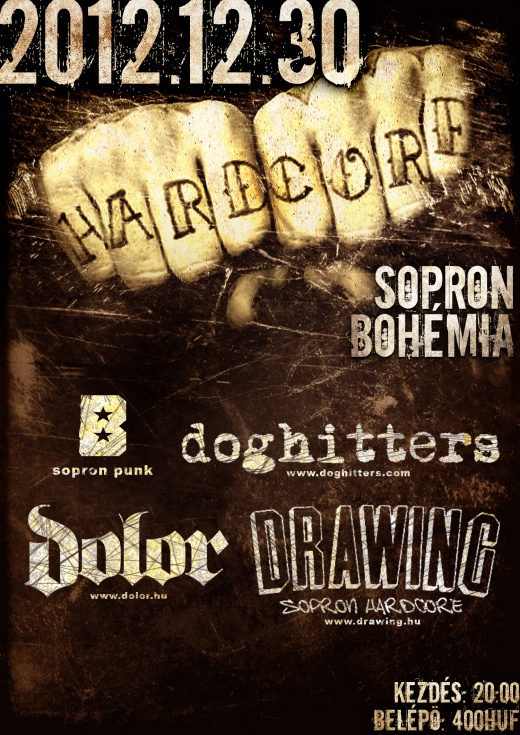 December 30-án Sopronban a Bohémiában egy kőkemény hardcore bulin vehet részt az érdeklődő. Fellépők a Drawing, Dolor, Doghitters zenekarok, kezdés 20:00 órakor, belépő 400 Ft.