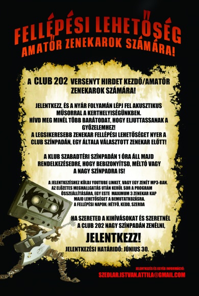 Szeretnél fellépni a Club 202 nagyszínpadán? Ha ez volt minden vágyad, akkor nem kell mást tenned, mint erre az emailcímre: szedlar.istvan.attila@gmail.com, küldeni egy bemutatkozó anyagot, aminek tartalmaznia kell egy Youtube linket, vagy a legjobb dalotokat mp3-ban. Aztán csak várni kell, hogy az előzetes válogatáson is megfeleljen a zenekar. A bemutatkozó koncertekre júliustól, hétfőn, kedden és szerdán kerül majd sor, és egy estén három bandának lesz lehetősége a bemutatkozásra. Légy Te a legjobb!