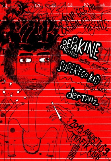 2013. augusztus 9-én 21:35-kor, a Trafik Klubban (VIII. Mikszáth Kálmán tér 2.), partnerségi program keretében lépnek fel a Depakine Chrono (CZ), a Superego Kid (CZ) és a derTANZ (HU). A Depakine Chrono tagjai néhány éve már jártak a Trafikban. Egy dob, egy gitár. Slussz. Lejátszott témák száma egy dalon belül. Sok. Nagyon sok. Ezt nevezik ők acid punknak, mások math rock- nak. Teljesen lényegtelen. Ha megnézed őket, látni fogod ez a két cseh srác nem viccel, viszont piszkosul élvezik azt amit csinálnak.