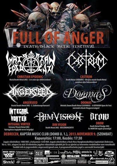 Rossz és jó hírek egy helyen: a mexikói Light of Dark és a budapesti Art Of Massacre zenekarok kénytelenek voltak törölni a fellépésüket a Full Of Anger Fesztiválon. A Light Of Darktól a turné során egy szállodában komoly mennyiségű pénzt, egy gitárt és egy útlevelet tulajdonítottak el, így hazatérni kényszerültek, az Art Of Massacre zenekarnál pedig logisztikai problémák merültek fel. Helyettük a sokak által már jól ismert és kedvelt ukrajnai Castrum zenekar érkezik a mexikóiak helyére, a koncertet pedig egy friss nyíregyházi formáció, az Integral Vortex nyitja majd, mely ugyan nem régi banda, azonban tagjai nem ma kezdték az ipart.