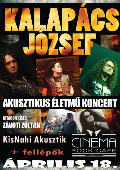 A 2009-ben alapított, folk-akusztikus rockot játszó Kalapács és az Akusztika életművének legemlékezetesebb dalait akusztikus hangszerelésben adja elő, valamint a magyar költészet remekműveinek megzenésített változatai gazdagítják a repertoárt. Závoti Zoltán kíséretében április 18-án a belváros szívében tart akusztikus életműestet Kalapács József, melynek helyéül a Cinema Rock Cafe szolgál. Az est során az egyre népszerűbb Long Road zenekar énekese, Nachladal Tamás Gábor és akusztikus formációja is színpadra lép, a magyar rockzene gyöngyszemeinek áthangszerelt változataiban bővelkedő műsorával.
