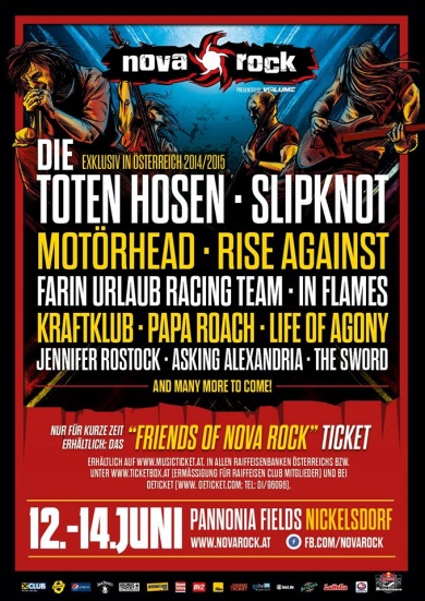 A Nova Rock Fesztivál ma jelentette be az első 2015-öt fellépőket, akik nem mások, mint a Die Toten Hosen, Slipknot, Motörhead, Rise Against, Farin Urlaub Racing Team, In Flames, Kraftklub, Papa Roach, Life of Agony, Jennifer Rostock, Asking Alexandria és a The Sword.