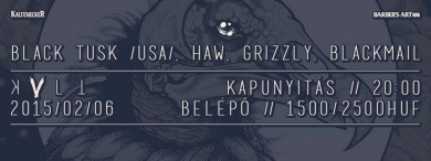 Ez a péntek este valahogy az átlag felettiek köré volt sorolható. Négy fajsúlyos, mocsárgőzös csapatot hallhattunk,a következő sorrendben: Blackmail, Grizzly, Haw és a turnéjukat kezdő amerikai Black Tusk. Hangsúlyozni szeretném, hogy a felhozatal nem volt rossz, és bizony nem kaptunk rossz végeredményt sem. Jó pesti szokás szerint, este nyolckor még kevesen lézengtek a KVLT újonnan átszabott helyén. Az elmúlt időszakban belsőépítészetileg nem kevés történt. Arcfelvarrást kapott a toalett, az előtér és némileg a koncertterem is. Nem részletezném, mert aki idelátogat, az nem fog csalódni a helyben.