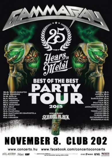 Ünnepi turnéval tér vissza november 8-án a Gamma Ray. A Kai Hansen által alapított német heavy metal zenekar idén ünnepli fennállásának 25. évfordulóját, és ebből az alkalomból az összes korábbi lemezüket újra kiadják, valamint egész életművüket felkaroló koncertprogrammal készülnek, amely összeállításában a rajongók is részt vettek. A turné magyarországi állomása a Club 202-ben lesz, ahol az egykori Helloween és Blind Guardian zenészeket is felvonultató Serious Black és az osztrák Dragony is játszik majd.