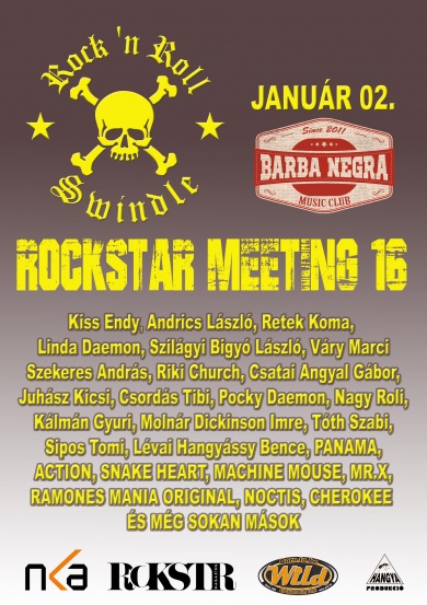 Hol máshol is kezdhetnénk az újévet, mint a hagyományos Rock ´n Roll Swindle évnyitón, a Barba Negrában? Január 2-án kerül megrendezésre a Rockstar Meeting, és ahogy már megszokhattuk, most is a fellépők sorát erősíti a hazai rock és metalélet színe-java A fellépő zenekarok között találjuk az Actiont, a Panamát, az eredeti Ramones Maniat, a Machine Mouse zenekart, a Mr. X zenekart, a Cherokee zenekart, a Noctist, és a Snake Heart is színpadra lép néhány dal erejéig.