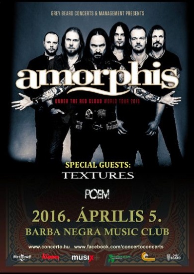A decemberi vendégszereplés után ezúttal fő zenekarként, teljes hosszúságú műsorral lép fel Budapesten az Amorphis. A finn metal zenekar Under The Red Cloud című lemezét mutatja be április 5-én a Barba Negra Music Clubban, ahol a holland Textures és a görög Poem is szerepel.