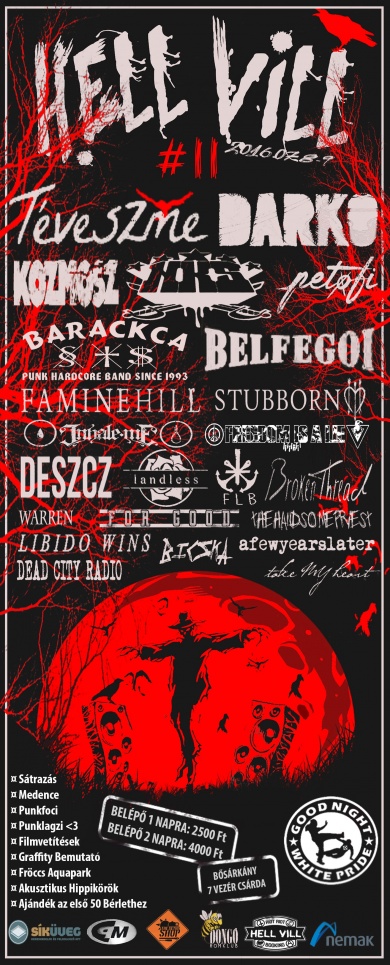 Idén 11. alkalommal kerül megrendezésre a Hell Vill fesztivál, összesen több mint 25 fellépővel, amely az évek során koncertsorozatból kétnapos, szabadtéri eseménnyé nőtte ki magát. A felhozatal idén is színes lesz. A megszokott punk, hardcore zenekarok mellett lesznek, akik oi, hip hop vagy a metál szférában reprezentálják magukat. A hazai underground zenekarok felhozatalát, mint a Téveszme, a Petőfi, a Kozmosz, az NKS, a Barackca, vagy a Stubborn, négy külföldi ország zenei képviselői tarkítják majd.