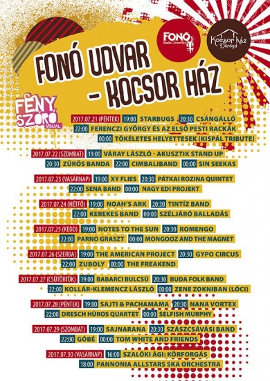 Július 21-étől a Fonó ismét a Művészetek Völgyében lesz, mégpedig a dörögdi Kocsor Házban, akikkel közös szervezésben töltjük meg ezt a tíz napot igényes nép- és világzenei programokkal. A zenei patchwork sokszínű és izgalmas lesz: fellép Ferenczi György és az Első Pesti Rackák, itt lesz a Cimbaliband, a Góbé és a vajdasági Sin Seekas, vendégünk lesz a Moszkvát megjárt és ott fergeteges sikert arató Kerekes Band, remek cigány muzsikákat hoz a Parno Graszt és a malajziai Rainforest World Music Fesztiválról éppen hazatérő Romengo is. Különleges lesz a Sena Band, és a Gypo Circus koncertje is. Kollár-Kelemencz László a Rengetegbe visz bennünket, Dresch Mihály pedig egy még soha nem látott húros kvartettel érkezik. Kiemelt esemény, hogy itt lesz a Szászcsávási Banda, akik óriásit fognak muzsikálni, ebben biztosak vagyunk! Szalóki Ági vasárnapi délután gyerekkoncertet ad. A Kocsor Ház programjait még színesebbé teszi a fényfestés, amivel fényfestőink befuttatják a teret.