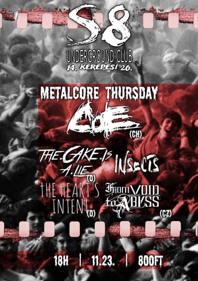 Bírod a kiképzést? Szabad a csütörtök estéd? Hát akkor gyere le november 23-án a fővárosi S8 Underground Clubba, ugyanis a budapesti Insects zenekar megtöri a csendet, ami az új album felvételeivel jár. Utánuk a From Void To Abyss érkezik, egyenesen Csehországból, metalcore és hardcore keverékével. Két német melodic hardcore banda is tiszteletét teszi, a The Heart’s Intent és a The Cake Is A Lie személyében. És ha még bírod energiával, semmiképp se hagyd ki a svájci Circle Of Execution drunkcore buliját! A hétköznapra való tekintettel még hazaérsz a nappali járatokkal is!