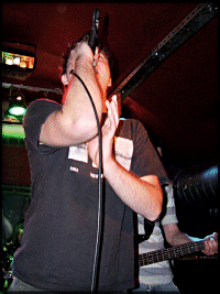 A gyorsan eldarált, rövid műsoroknak és a jó szervezésnek köszönhetően az ígértnek megfelelően fél tizenkettőkor már a színpadon is volt az Ensign - nem győzöm elégszer hangsúlyozni, mennyire emeli egy koncert élvezhetőségét, ha az ember előre tud számolni azzal, hogy mikor kezdődik és meddig tart a program, s szerencsére ez a buli ebből a szempontból is jelesre vizsgázott. A muzsika viszont nem indult be egyből, mert Timnek elég nehezen sikerült csak némi közeledésre bírni a színpadtól valóban meglehetősen távol álldogáló és meglepő módon visszafogottan viselkedő közönséget. Eleinte még megfenyegette az egybegyűlteket, hogy nem lesz koncert, ha nem mennek előrébb, de aztán egy idő múlva, némi sikert tapasztalva, meg egy kicsit elunva a noszogatást, csak startot vezényelt a bandának, s a legjobb gyógyírnak végül ez bizonyult, mert ahogy ezek a szimpatikus srácok hihetetlen odaadással, örömmel és hatalmas elszántsággal tekerték a nótákat, úgy szépen lassan feléledt a publikum is. (Valakinek annyira sikerült felélednie, hogy az egész korsó sörét mérnöki pontossággal az arcomba nyomta a terem túlsó feléből...) A csúcsteljesítménytől ugyan ezúttal távol maradt a nézősereg, az Ensign viszont teljes fordulatszámon pörgött, s legalább a jó hangulat érezhetően átragadt mindenkire.