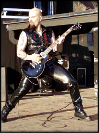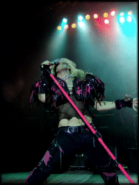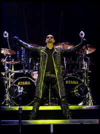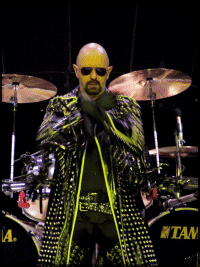 Viselkedését nézve meglehetősen visszafogott volt a frontember, sőt szerintem eleinte kicsit morcos is keveset beszélt a dalok között és nem szántotta fel a színpadot, még annak ellenére sem, hogy meglehetős alapossággal bejárta annak minden szegletét. Elég gyakran el is tűnt a kulisszák mögött, habár ilyenkor mindig át is öltözött, szóval semmi rosszra nem kell gondolni. Ráadásul szerintem látványos is volt az a kevés mozgása (főleg a robotszerű mozdulatok tetszettek), s a koncert hevében azért láthatóan megjött a jókedve is, a végére meg már kifejezetten vidámnak tűnt. A produkció egészét pedig végképp nem lehetett tartózkodónak minősíteni, hiszen a többiek is rendesen kivették a részüket a nyüzsgésből, élen a virgonc K. K. Downing-gal, aki egymagában egy egész banda helyett elfutkározott, -pózolt és -headbangelt.