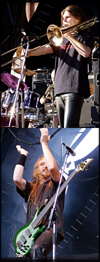 A D. N. R. Low Practice what You Preach háromelemű energiabombával robbantó csapat a létező legpontosabban mutatta be, milyen is egy ellenállhatatlan” metalkoncert. Kivédhetetlen dalok, emberileg és hangszeres tudásukat nézve egyaránt fantasztikus zenészek és óriási hangulat a recept egyszerű, de olyan jót kevesen tudnak kotyvasztani belőle, mint a Testament. Vegyük sorra az egyes hozzávalókat! Olyan dalok hangzottak el a már említett nyitótriászon kívül, mint a The Haunting, a Sins of Omission, az Electric Crown, az Over the Wall vagy a Disciples of the Watch, amelyektől minden normális thrashernek/metalosnak össze kell, hogy fusson a nyál a szájában. A zenészek játékának minőségét már a nevük és a múltjuk borítékolja. Paul Bostaph ugyebár a Forbiddenből és a Slayerből ismerős mindenkinek, amely bandákba soha nem engedtek be akárkit az ütősök mögé, s a fickó persze ezúttal sem fogta vissza magát: folyamatosan headbangelve, bólogatva küldte a pörgetéseket, break-eket, a cinjei állandóan csilingeltek, az állak pedig már csak ettől is a földön landoltak. Társa a ritmusszekcióban Steve DiGiorgio (csak két zenekarnév: Sadus és Death), akinek láttán-hallatán majdnem sírva fakadtam: fretless bőgőn, kétnyakú basszusgitáron, pengetővel, ujjal, a létező összes módon mindent bemutatott, amit azon a hangszeren el lehet követni a teljes elképedés pedig akkor lett úrrá rajtam, amikor lazán végigkövette bőgőjén a szólógitár futamát, beleértve még a nyújtásokat is A hathúroson ezúttal egyedül bárdoló Metal Mike (Halford, Pain Museum) kinézetre kiköpött Dimebag Darrel, de tudásban is felveszi az említett zenésszel a versenyt: hanyag eleganciával, simán állt helyt egyedül is, a szólói pedig egyszerűen káprázatosak voltak. Végül pedig ott a banda szíve-lelke, az énekes Chuck Billy, akiről most már mindenki tudja, hogy még a Halálnak is az arcába nevet és visszazavarja oda, ahonnan jött kérem szépen, ami hangorkán ennek a kedves óriásnak a torkából kiszakadt e rövid idő alatt, azzal egy szélmalmot hónapokig lehetne működtetni! A legnagyobb természetességgel és könnyedséggel törtek elő belőle a D. N. R. hörgő-bömbölő témái éppúgy, mint az Electric Crown bődületes dallamai, erőlködés sehol, csak az állandó, őszinte, széles mosoly az arcán, csakúgy mint a többiekén. A jókedv persze másodpercek alatt átragadt mindenkire - hátra ugyan nem nagyon néztem, de az biztos, hogy az első sorokban a festett arcú Cradle-rajongók éppúgy üvöltötték a szövegeket, mint a kitérdelt thrasherek, s a színpadon és a nézőtéren összeszámolható vigyorokat egymás mellé rakva lazán körbeérhettük volna az Egyenlítőt. A pokol akkor szabadult el végleg, amikor Chuck az Over the Wall előtt némi stagedive-olásra bíztatta a jelenlévőket az eredmény ugyan kicsit más lett, de a hangulat így is tovább fokozódott: az invitálásra rajongók tömege áradt a színpadra, eltakarva az énekesen kívül a teljes zenekart, hogy ott folytassák a fejrázást, léggitározást, miegymást. Mondjuk jobb lett volna, ha egy szám után mindenki maga veszi észre, hogy itt az ideje távozni, és nem a biztonságiaknak meg a technikusoknak kell letessékelni a nagyérdeműt a világot jelentő deszkákról (amik azért mindezek ellenére is a zenekarnak vannak kitalálva), de kit is érdekel ez, amikor egy ilyen koncertet láthattunk! A tavalyi Sziget-buli alapján igazán sokat vártam tőlük, de ők megint minden elvárásomat felülmúlták. El lehetne esetleg intézni valahogy, hogy a Testament ezentúl minden nyáron fellépjen úgy három-négy hazai fesztiválon?