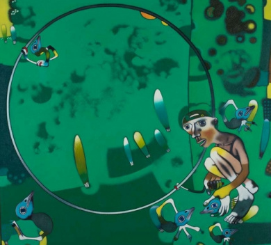 Földi Péter Kossuth- és Prima Primissima díjas festőművész életművének keresztmetszetét mutatja be a tárlat; nagyobb hangsúllyal az ezredforduló után készült művekre koncentrálva, de felvillantva a jellegzetes „Földi-stílus” kialakulásnak kezdeteit is. Földi Péter 1972-ben diplomázott az egri Tanárképző Főiskola matematika-rajz szakán, és tanulmányai elvégzését követően szülőfalujába, a nógrádmegyei Somoskőújfaluba tért vissza. Azóta is ott él és alkot. Ihletet a falu mindennapi életéből, a mezőgazdaság, a kertek, a háziállatok vagy épp a kocsmák világából nyer, ám mikrokörnyezete a művészi feldolgozás révén kozmikussá, transzcendentálissá tágul számunkra. A létezés különféle emberi, állati és növényi formái népesítik be műveit, élénk koloritú foltrendszerrel festve, és gyakran szokatlan perspektívából – erős felülnézetből, vagy éppen több nézőpontból – mutatják jeleneteit. A játékosságot és az iróniát sem nélkülöző minidrámái rokonságba hozhatók a gyermekrajzok és a népművészet világával is. A hétköznapok ábrázolása olykor mesés vagy mitológia horizontot kap, ám hiába keresnénk egy-egy jól ismert történetet a képek mögött, e narratívák mindig a művészre szabottak, szuverének maradnak. A Műcsarnok első, retrospektív Földi Péter-tárlatán, a művész olajfestményei mellett bronzszobrai is helyet kapnak.