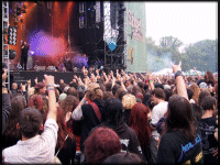 A koncert előtt a közönségnek videón is üzenő Lukács Laci balesete miatt az In Flames ráadásul még egy műsorsávval későbbre is került, aminek előnyeként nem kellett sem fülledt melegben, sem szakadó esőben nézni őket. Szép számú látogató sereglett is össze a Nagyszínpad elé, de szerintem ez nem csak a relatíve kellemes körülményeknek volt köszönhető. A porondmester szokásosan felesleges dadogó közönséghergelése után nagy lazán be is masíroztak a svédek talpig feketében, elfoglalták a helyüket, és a Pinball Map-pel a húrok közé csaptak. A hatalmas metalhimnuszokból ezennel pedig hatalmas drum and bass party kerekedett a keverős szakszerű tevékenységének köszönhetően, mindent elsöprő lábdob- és bőgőhangzással, a háttérben cincogó gitárokkal és sustorgó énekkel, a t. egybegyűltek nyilvánvalóan legnagyobb megelégedésére. Botrány volt ez a megszólalás, még akkor is, ha a későbbiekben azért előbbre kúsztak a hathúrosok, és a torokból is többminden hallatszott a koncert második felében ez így akkor is minden volt, csak metalkoncerthez méltó nem. A tények tények, felesleges is tovább dühöngenem ez ügyben, de annyi biztos, hogy amennyire hangosítás egy koncertélményt tönkretehet, annyira ez sikerült is ezúttal.