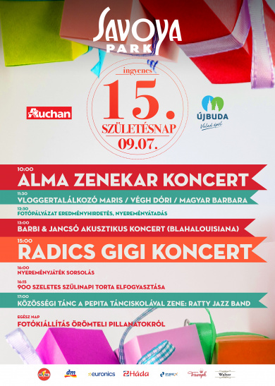 Nagyszabású ingyenes rendezvénnyel ünnepli 15. születésnapját a Savoya Park szeptember 7-én. A budai bevásárlóközpontban koncertet ad az Alma együttes, Radics Gigi és Barbi & Jancsó (Blahalouisiana). Lesz még vloggertalálkozó, egy gigantikus torta tálalása és közösségi tánc élő zenére.