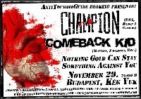 szerző: Antitouristguide.Cjb.NetAntiTouristGuide Booking bemutatja: Champion (USA), Comeback Kid (CAN), Nothing Cold Can Stay (A), Something Aganist You 2004. november 29., hétfő 20 óra, Kék Yuk (Budapest III., Fényes Adolf u. 28.)