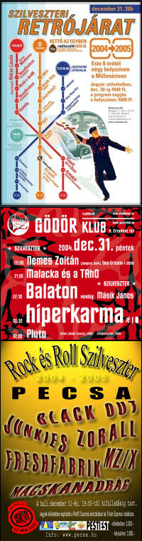 Mostanában mostohán bánik a sors a rockerekkel a rendezvények szempontjából. Hogy változtassunk ezen, rendezünk egy fergeteges rockszilvesztert magyarország feltörekvő, és befutott rockbandáival. 150Ft-s sörrel és a rockkedvenceiddel bulizhatod át magad 2005-be. A buli 19 órától kifulladásig tart. Kapunyitás:18 óra. A várható sorrend: Macskanadrág, Black-Out, Mz/X, Freshfabrik, Zorall, Junkies