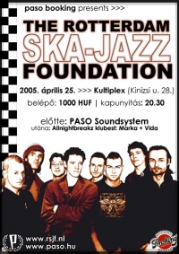 Ki hinné, hogy a fapapucsok, szélmalmok, tulipánok és egyéb kultúrnövények földjén a reggae élet központja nem is annyira Amszterdam, hanem az egyik legnagyobb népsűrűségű holland város, Rotterdam. Ezt mi sem bizonyítja jobban, mint hogy a számtalan reggae formáció mellett, ez a város adja a műfaj egyik peremvidékének sztárját is, a reggae-ből is táplálkozó, zenéjét azonban mégis főként a ska-ra és a jazz-re építő, Rotterdam Ska-Jazz Foundation-t is. A kiváló formáció tavaly áprilisban már járt nálunk, s most kicsit több, mint egy év elteltével, április 25-én visszatérnek, hogy megismételjék akkori fergeteges, csaknem két órás koncertjüket, melyet a közönség részéről a teltház, a kiapadhatatlan tánckedv és a másnapi izomláz jellemzett. Az öltönyösökkel tűzdelt, fülledt karibi est idén nem az állóhajóra, hanem a Kultiplex-be költözik.