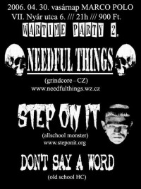 Április 30-án a mélyre hangolt, nyers és kegyetlen grindcore hívei örülhetnek a cseh Needful Things budapesti bulijának. A banda már hosszú évek óta sikeresen zajong Európa szerte, az új nagylemezük, a Dead Point pedig nemrég jelent meg a Khaaranus production gondozásában, ahol olyan bandák vannak még, mint a Cerebral Turbulency, Poppy Seed Grinder, Alienation Mental ...