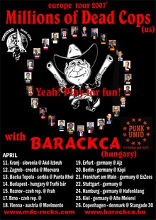 2007. április 14-én ismét ellátogat hozzánk Amerika egyik leghíresebb punk-hardcore zenekara, a Millions of Dead Cops. Az immár 27 éves zenekar 3 alapító taggal (mivel a 4. Al Schvitz a kaliforniai állami börtön vendégszeretetét élvezi jelenleg) ismét egy nagyszabású európai turnét állított össze március-június között. A zenekar 1980-ban alakult Texasban, s bár azóta a székhelyük többször is változott (New York, Oregon és Kalifornia között), változatlan vagy még nagyobb lendülettel adják elő a politikailag fontos dalaikat. Igaz, az elején még ők is főleg az italozó-drogozó zenekarok sorába tartoztak, aminek 1997-ben Dave elvonókúrája vetett véget. Ekkor volt a zenekar életében is egy hosszabb szünet, de 5 évvel később visszatértek, majd rögtön egy Európa turnét szerveztek le óriási sikerrel. 2004-ben kiadták a Magnus Dominus Corpus című albumukat, és megmutatták, hogy ennyi idő elteltével is lehet ütős és nagyon jó szöveggel ellátott albumot készíteni. A kiadásban a Sudden Death Records közreműködött akinek a feje Joey Shithead Keithley (DOA). A Millions Of Dead Cops egyike volt az első zenekaroknak akik a vegetáriánus életnek próbáltak propagandát csinálni: ők írták meg az első ilyen jellegű dalt a Chicken Sqawk címmel: és igyekeztek az amerikai fiatalok által istenített példaképekről lehúzni a leplet John Way Was a Nazi dalukkal, de nagy aggodalmat keltettek a Vatikánban is a Millions of Damn Christians albummal, mely felkerült a pápa álltal is jóváhagyott 10 leggonoszabb és sátáni album közé! A zenekar tagjai aktívan részt vettek és vesznek különböző szervezetek életében, és szeretnék felhívni a figyelmet a világon jelen lévő éhínségre, mely főleg a gyermekek között szedi az áldozatait. Ezen az estén több, mint egy órás műsorral állnak a színpadra, és mind a régi, mind az újabb albumokról játszani fognak dalokat.