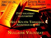 Július 24-én, kedden 21 órától a Gödör Klubban a PAD folyóirat ingyenes felolvasóestjén vehetnek részt az érdeklődök. Ezt követően a Holt Költök Társasága mutatkozik be akusztikus műsorával, majd az őj felállású Nulladik Változat zárja az estét.