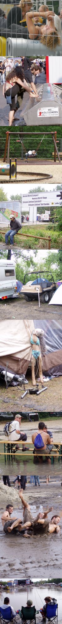 Megérkezik a fesztiválok fő ellensége, az eső. Hirtelen jön, és mintha dézsából öntenék, nem akar elállni. Mindenki fedezéket és fedelet keres: jó dolguk van a koncertsátorban állóknak, a pultnál dekkolók már vizet is kapnak az ital mellé. A HammerWorld sátorban a mindig korrekt Subscribe-ék húzzák modern rockjukat, amikor összeakadok Boros Sanyival, akit csak Csubiként ismer a világ. Elkezdünk inni, fogy a sör és a rövid. Csubiról nem árt tudni, hogy 1200 koncert és 140 fesztivál van mögötte, nyaranta vagy fél tucat többnapos zenei rendezvényen a tiszteletét teszi. Én még valamelyik évi Wanted Fesztiválon ismertem meg, amikor a komplett gatyázatát a földön hagyva tápászkodott fel a kisszínpad előtt. Ott a karaoke alatt nagy nehezen sikerült kiböknie a mikrofonba, hogy az édesanyját szereti a legjobban a világon. Szegény Csubi nem egy balhés figura, csak szeret inni, tavaly mégis kint töltötte az egész Szigetet a bejárat körül, ugyanis már az első napon kitették a szűrét. Becsületesen megvertek a biztonságiak meséli enyhén szólva rekedt hangján, majd hozzáteszi, hogy azért én is adtam nekik. Hiába, ők többen vannak. Persze más buliban is akadtak bunyók, megy is a sztorizgatás. Mondom neki, hogy idén inkább bentről élvezze a Szigetet. Az eső meg csak szakad. Kezdünk elázni, lassan belülről is. (ma)