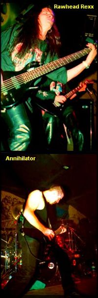 Végre elered az eső, viszont továbbra is hideg van, így hát most már semmi akadálya, hogy az E-klub jól lezárt bejárata előtt kanyargó, legalább 100 m-es tömött sort alkotók elkezdhessék magukat igazán rosszul érezni. A 19.00 re kiírt kezdéshez képest 19.40-kor már be is léphet az első szerencsés, majd további kb. 5 perc múltán színpadra lép az első zenekar, így hát a Rawhead Rexx gyakorlatilag üres teremnek kezd játszani ( jó érzés lehet), miközben az egyébként időben érkezett érdeklődők még odakint állnak az esőben ( szintén kellemes lehet). Mindezeket nem említeném, ha először fordulna elő, de sajnos nem így van. Gondolom, ugyanitt a hétvégi diszkóba érkezőkkel ezt nem teszik meg, hiszen akkor a következő héten a táncos lábúak más dizsit keresnének, nekünk persze nincs más választási lehetőségünk. Ezzel be is fejezem az elégedetlenkedést a klubba bejutva hamar elkezdenek jóra fordulni a dolgok. A Rawhead Rexx bulijának ugyebár lekéstük a felét, de a maradék időben egy lelkes, jó kiállású power-speed zenekarral szembesülhetünk. Ha különlegességet nem is hallhattunk, az intenzitás a Metaliumot idézte.